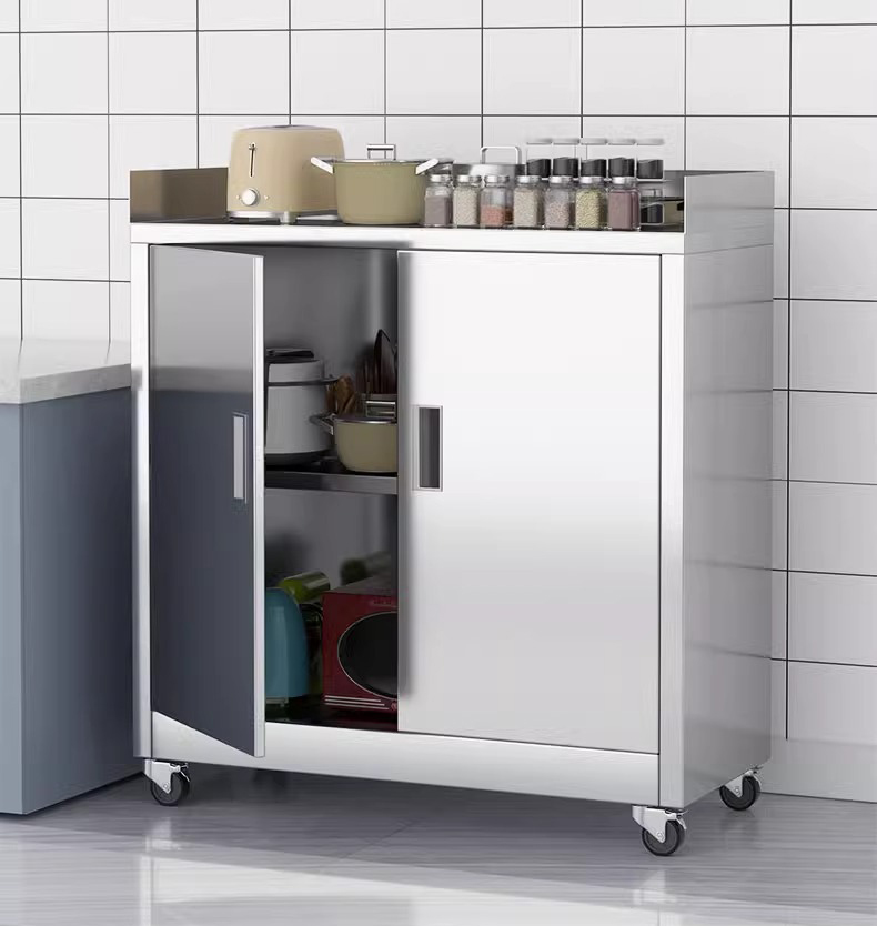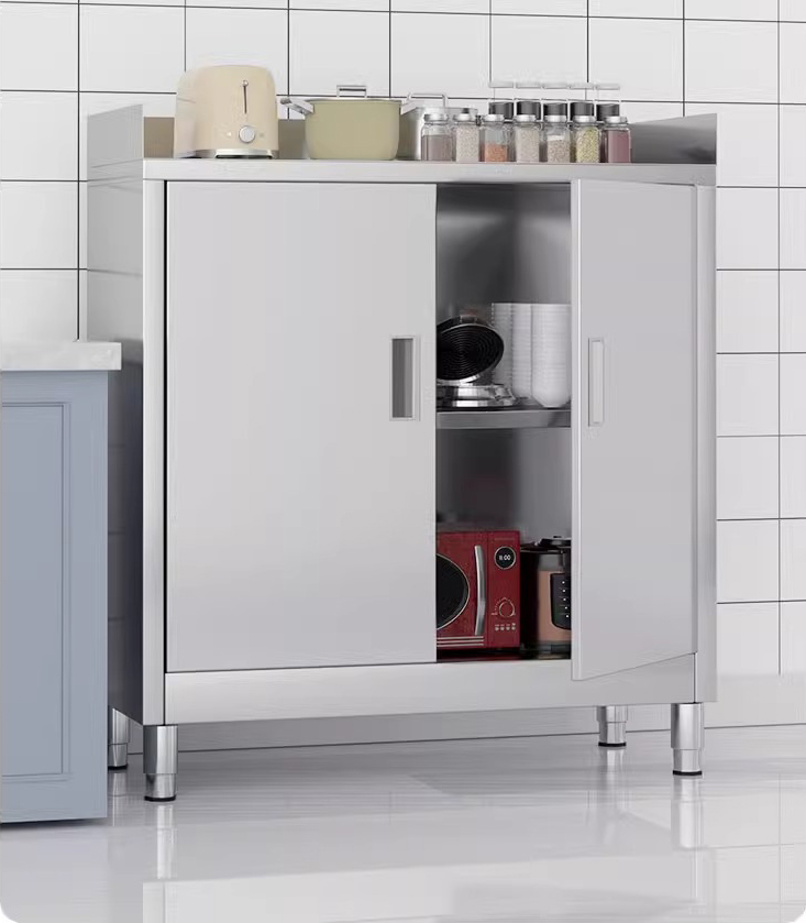 The standard material is :201# stainless steel,1.2 mm thickness.Material 304# stainless steel 1.0mm,1.2mm,1.5mm thickness and 316# stainless steel 1.2mm,1.5mm thickness are available for option.The size can be custom made according the space of kitchen.Standard door opening method is sliding.Swing door opening method can be made.